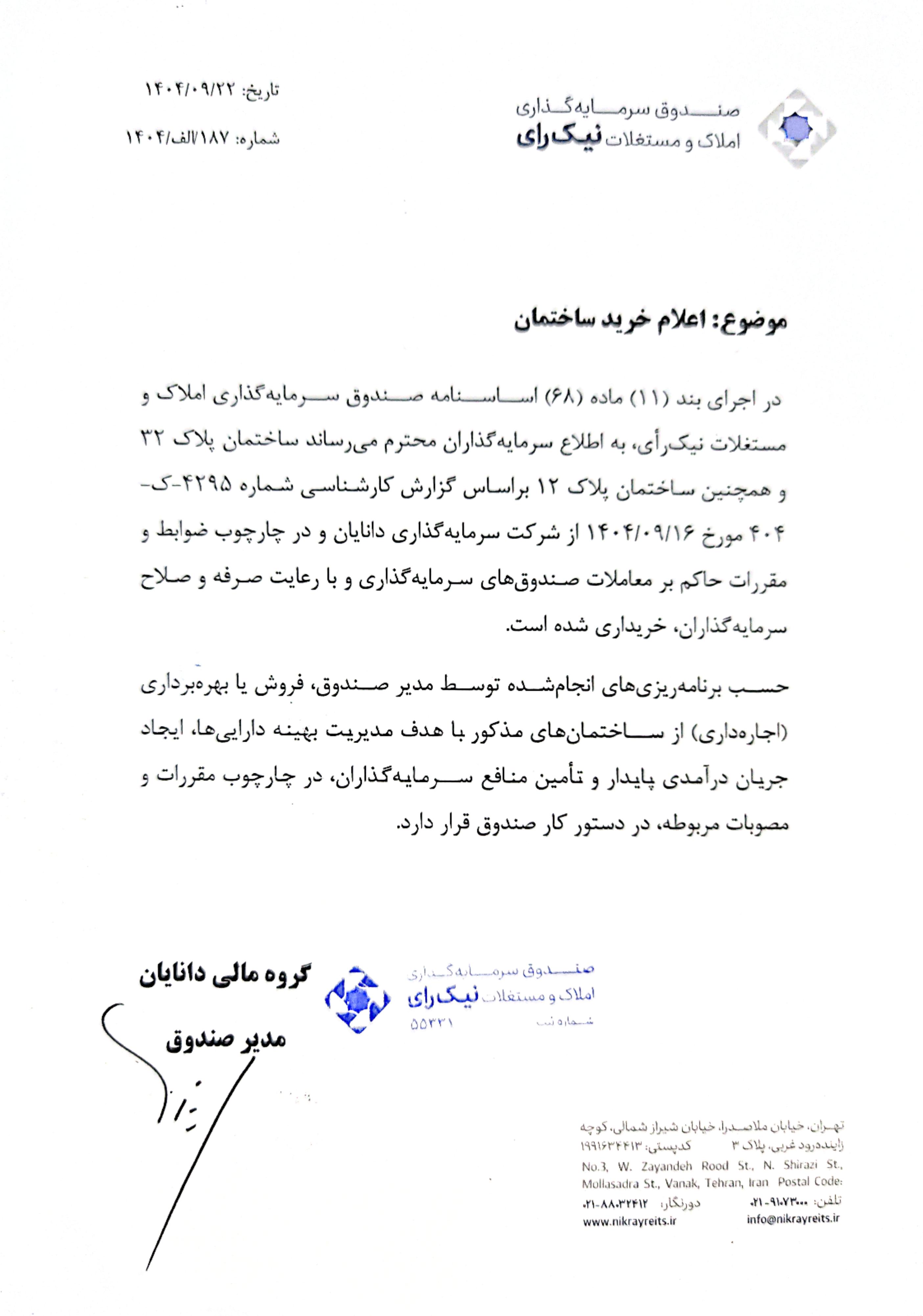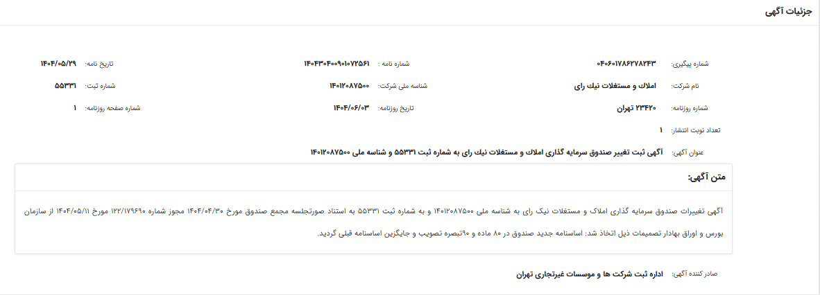 تصميمات مجمع صندوق سرمايهگذاري املاک و مستغلات نيکرأي مورخ 1404/06/15