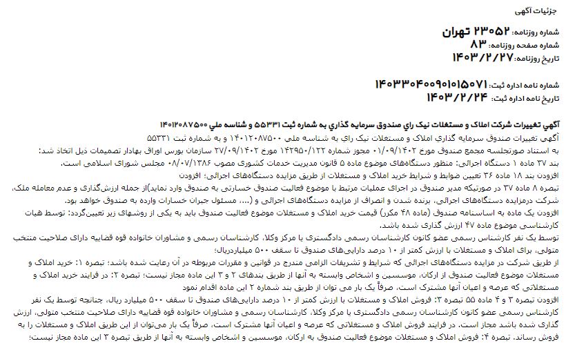 آگهی تغییر اساسنامه صندوق املاک و مستغلات نیکرای طی مجمع مورخ 1402/09/01