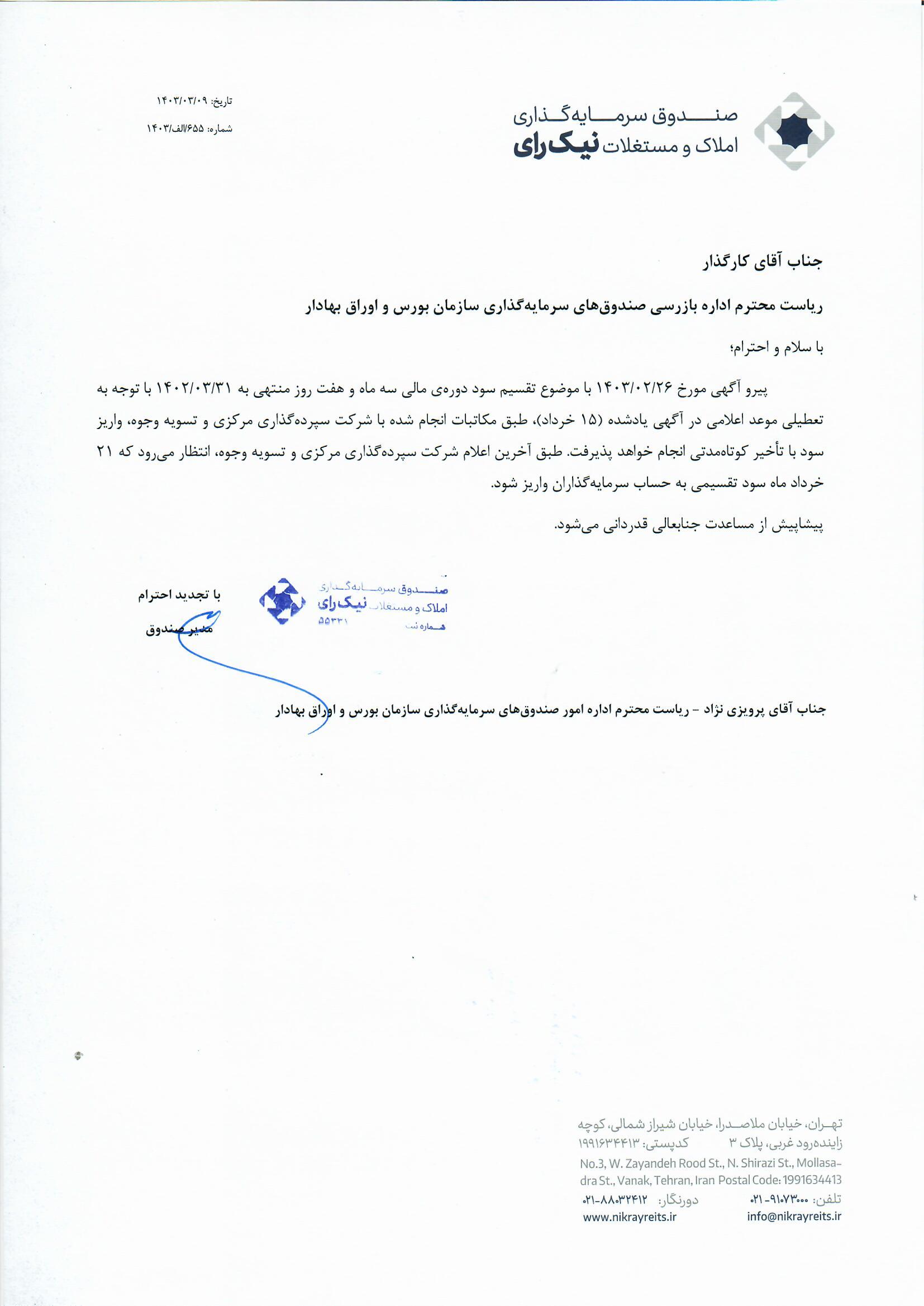 تصميمات مجمع صندوق سرمايه گذاري املاک و مستغلات نيکرأي مورخ 1403/03/06