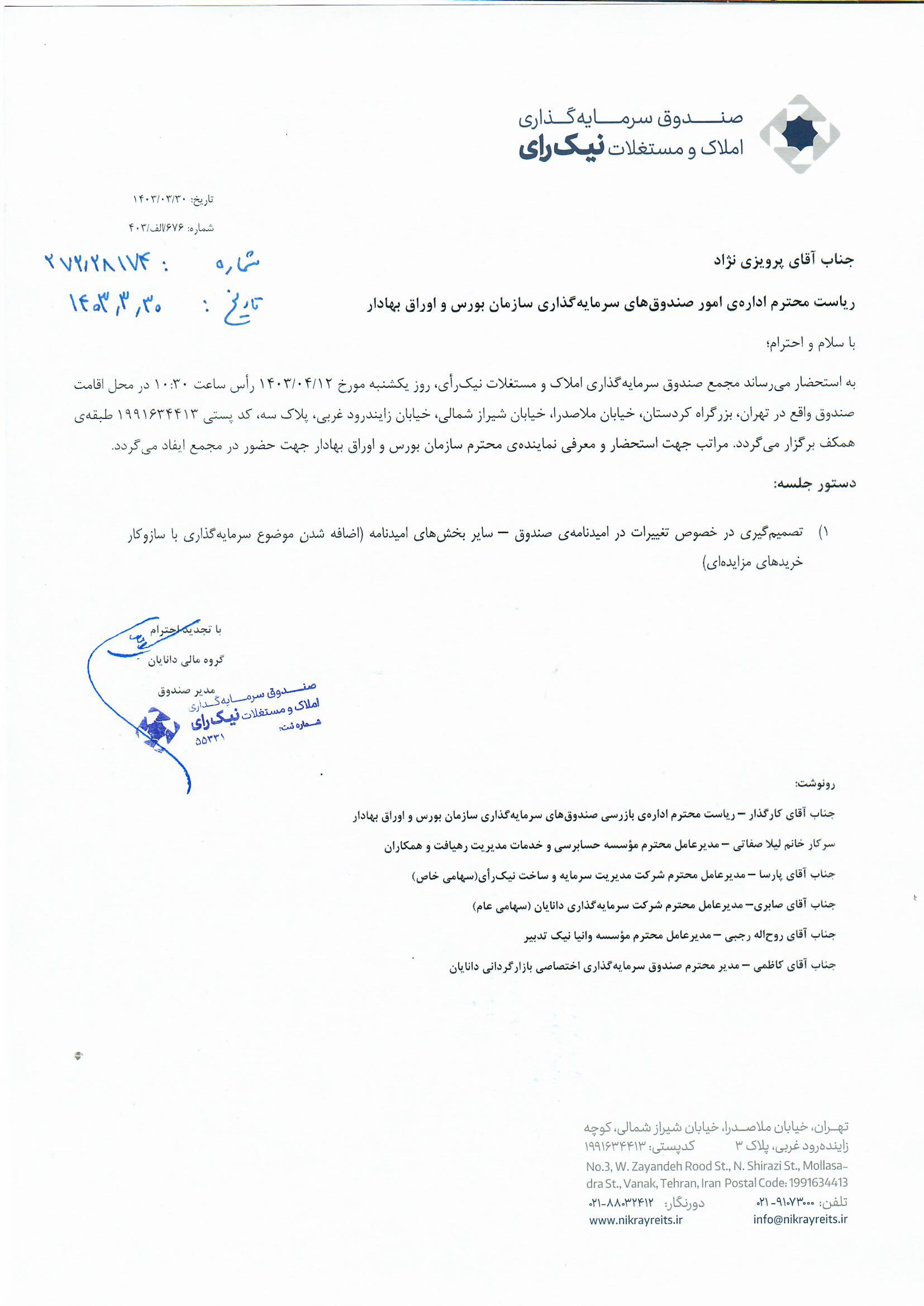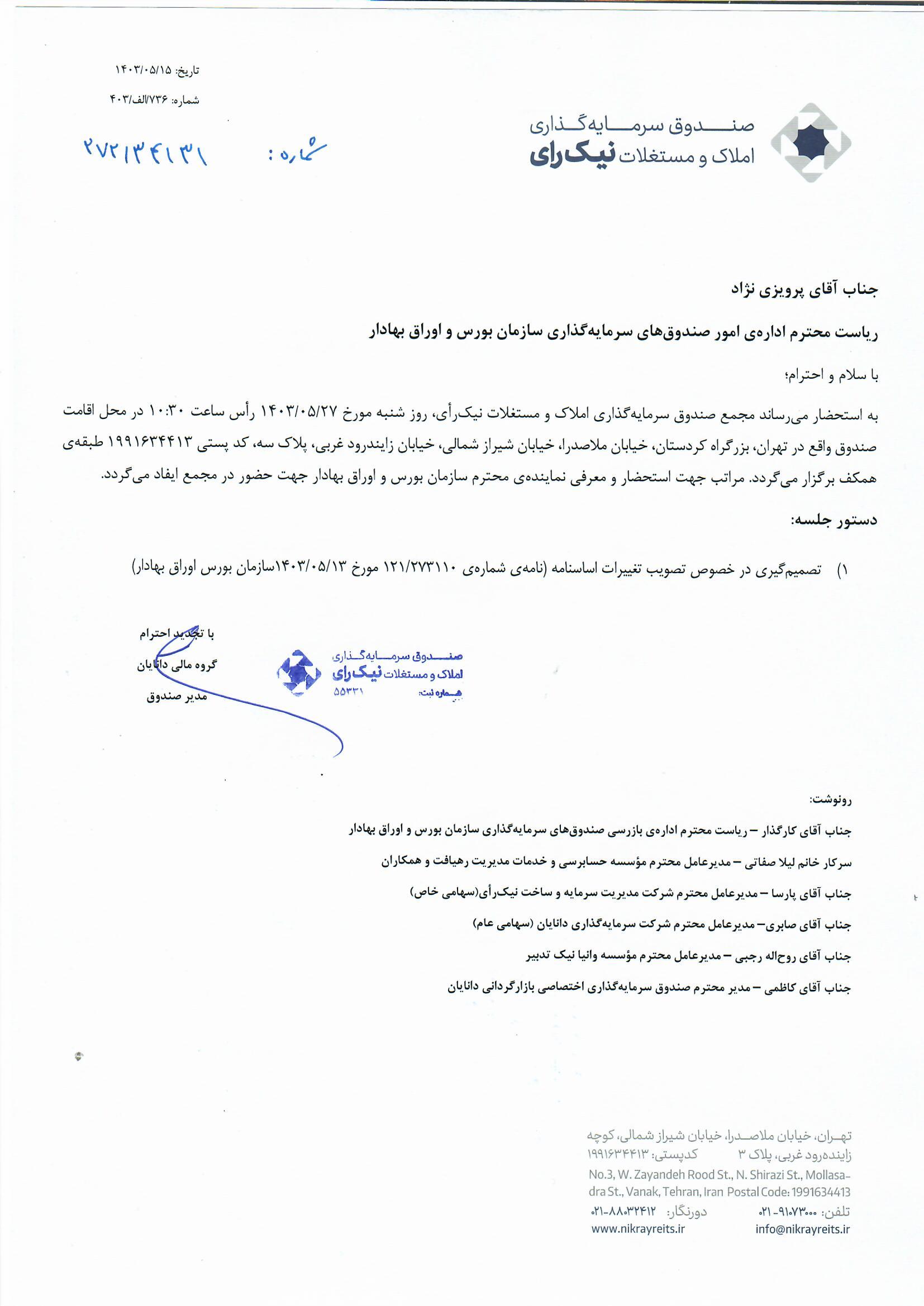 آگهي دعوت به مجمع صندوق سرمايهگذاري املاک و مستغلات نيکراي در تاريخ ۱۴۰۴/۰۳/۰۷